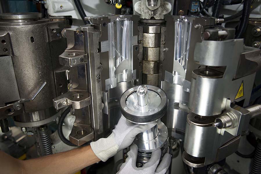 The specific sharp base design is achieved using the new Sidel patented base mould system: the Base OverStroke System (BOSS). BOSS is a piston activated in the blowing phase to stroke the base. This mechanical element allows for the raising and lowering of the base during the bottle-forming process independent of the opening and closing of the two half-shells of the mould.